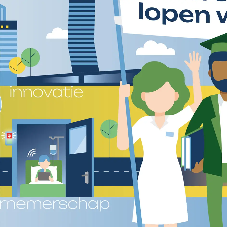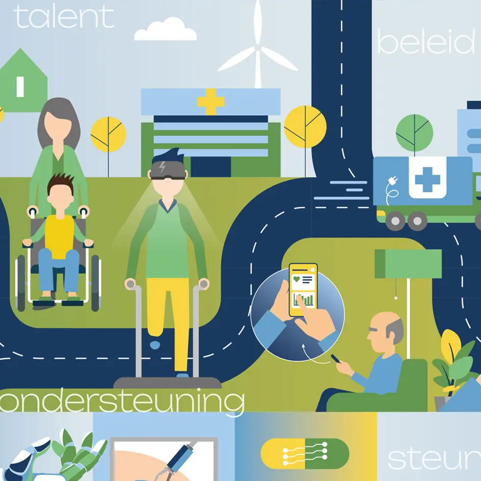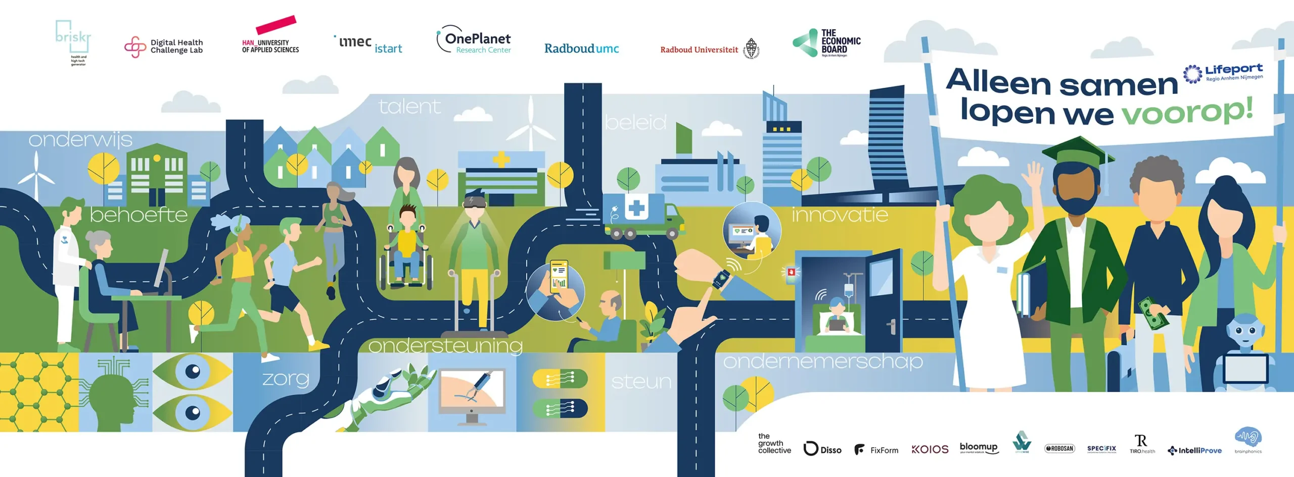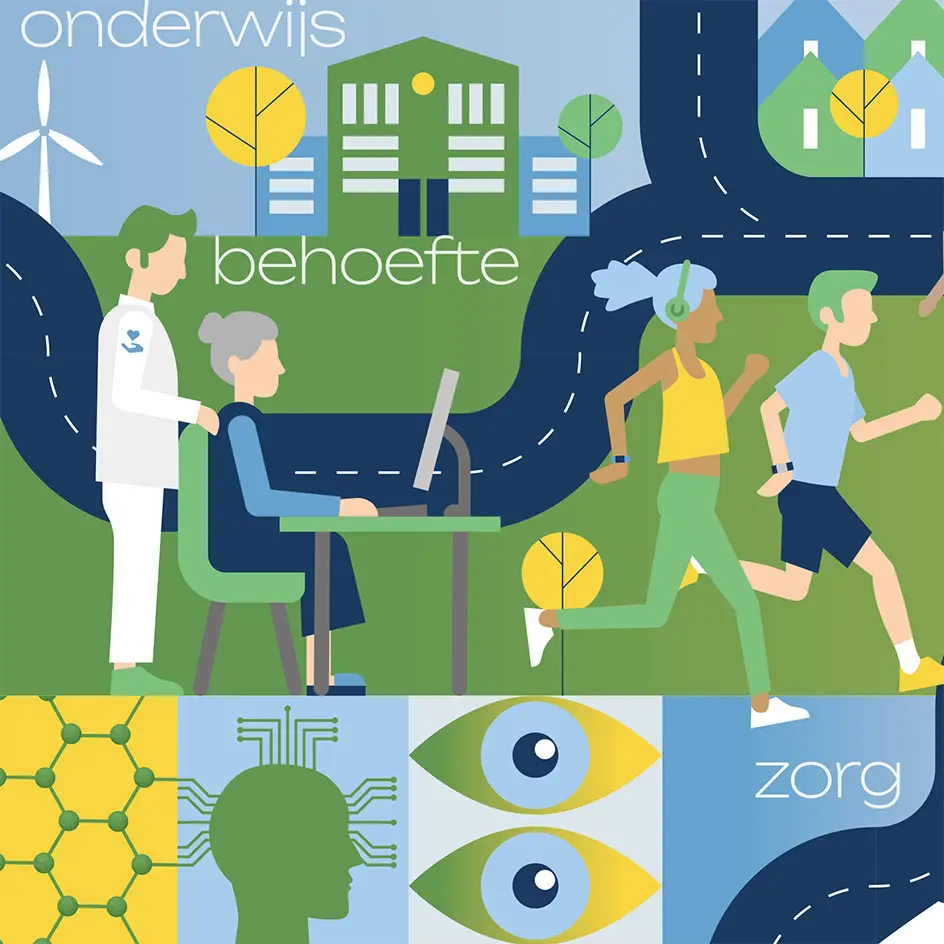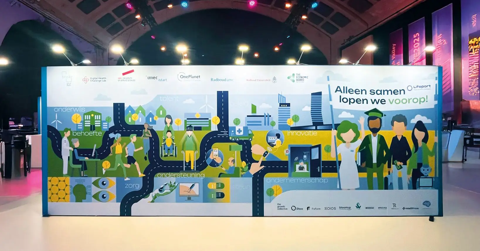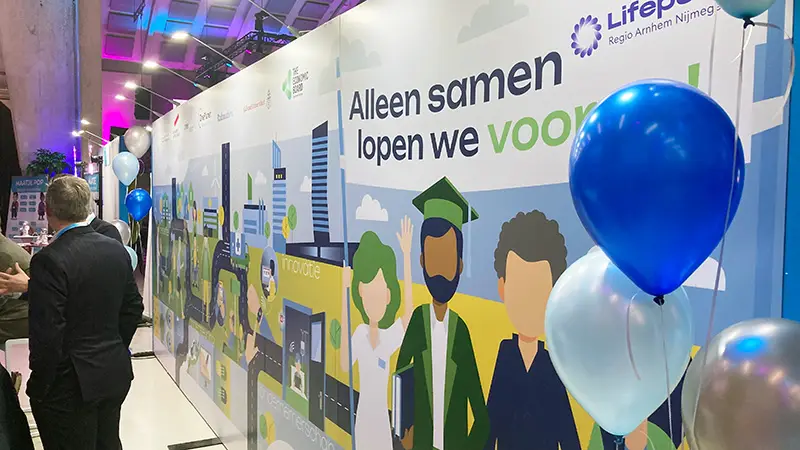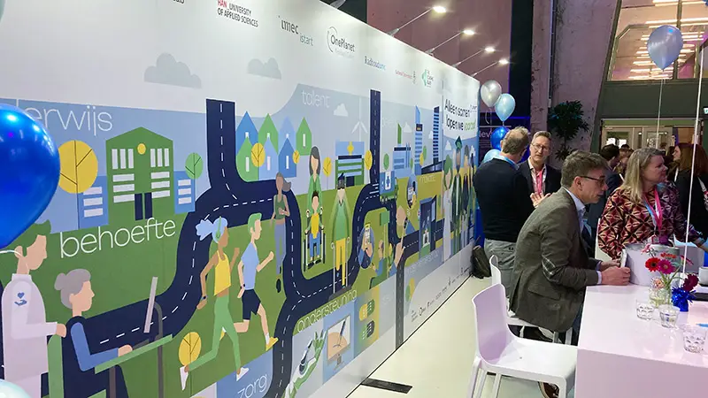 Een infographic die bezoekers informeert en inspireert over de gezamenlijke aanpak en gedeelde visie op innovatieve (ouderen)zorg, de noodzaak voor digitale- en techoplossingen, maar ook de vitaal functionerende burger in een economisch gezonde maatschappij visualiseert.’ Dat was de opdracht die we meekregen voor het design van een beurswand van 7×2,5 mrt voor het Health valley Event 2025. Het werd een echte eyecatcher.